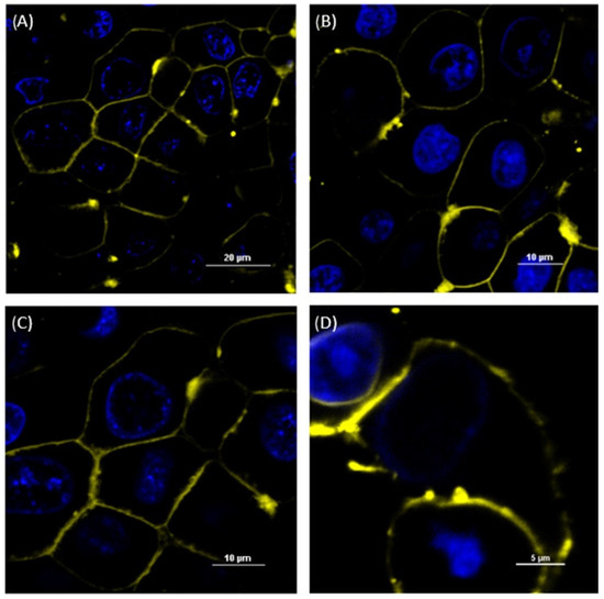 Confocal laser scanning microscope (CLSM) images of MDCK II SENS (A), MDCK II ABCB1 (B) and MDCK II ABCC1 (C) incubated with the DiI-stained MFVs and MDCK II BCRP (D) incubated with Nile red-stained MFVs for 15 min. The nucleus was stained with Hoechst 33342. The outer membrane was stained by adding the MFVs containing DiI after 15 min of incubation, indicating the fusion of DiI-containing MFVs into the cell membrane. The scale bar is 20 µm for (A), 10 µm for (B,C) and 5 µM for (D). We observed the agglomeration of some of the MFVs after their addition to PBS.