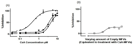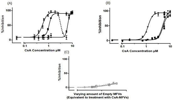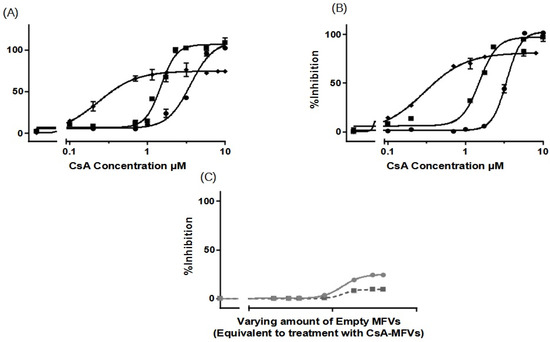 The results from the Pheophorbide A accumulation assay (Figure 5B) showed that the IC50 of CsA in solution was 5.41 µM, where the presence of drug-free MFVs helped it reach a value of 4.60 µM, and for CsA delivered via MFVs, the IC50 is 1.22 µM.