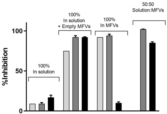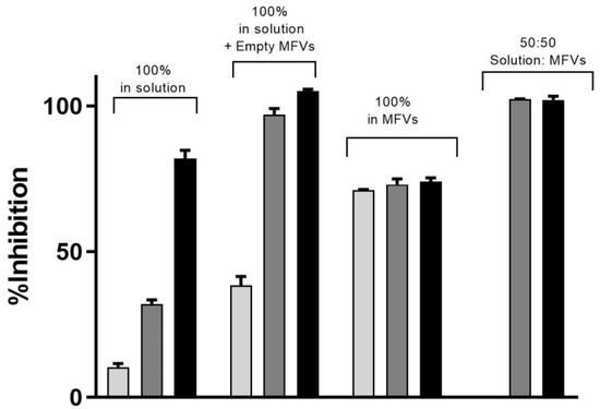 Three different concentrations of CsA’s inhibitory effect toward the efflux of Hoechst 33342 via ABCB1 shows that despite the increasing efficacy of CsA at its very low concentration, the maximum inhibition achieved remained same despite the increasing concentrations of CsA (light grey: 1.25 µM; dark grey: 2.5 µM; black: 5 µM). To reach a 100% inhibitory effect on ABCB1, it is necessary to deliver the CsA intracellularly as well. The benefit of using MFVs for CsA inhibitory efficacy is clear in all four combinations. Notably, the presence of CsA in the solution was crucial for achieving the maximum inhibitory effect (Imax) of 100%.