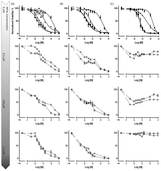 The concentration-dependent multidrug resistance (MDR) reversal assay conducted using an MTT-based viability assay across all four cell lines. The MDCK II parental (■) cell line served as the control cell line for each dataset. Dose–response curves were generated for cells with an overexpression of MDR transporters without treatment (●), and with 5 µM (▲) and 10 µM (▼) of CsA, alongside varying concentrations of cytotoxic substrates. Each column represents a specific cell line and transporter: MDCK II MDR1 (Daunorubicin) (Column (A)), MRP1 (Daunorubicin) (Column (B)), and ABCG2 (SN-38) (Column (C)). In total, three different final MFV concentrations (0.5, 0.8 and 1.5 µM) of 2 different formulations (○: CsA-MFV/0.5 mM and ☐: CsA-MFV/1.0 mM CsA-load) were investigated. In the first row, it is evident that the presence of the inhibitor at a final concentration of 10 µM effectively reverses the resistance of MDCK II cells overexpressing all three transporters. At a concentration of 5 µM, CsA induces intermediate re-sensitization for ABCB1 and demonstrates relatively lower efficacy for ABCG2. In row two, for dataset A (ABCB1-overexpressing cells), the utilization of 1.2 µM CsA via MFVs demonstrates comparable inhibitory potency to that of CsA in solution at a final concentration of 5 µM. However, at a final concentration of 0.5 µM, MFVs delivering 1.2 µM CsA (○) exhibit a slightly lower impact, particularly at lower cytotoxic drug concentrations, compared with MFVs delivering 2.4 µM CsA (☐). Transporter saturation occurs at lower concentrations due to the effective delivery of CsA by MFVs for both ABCB1 and ABCC1. In the case of ABCG2 cells (dataset (C)), lower concentrations of MFVs containing varying amounts of CsA prove to be slightly more effective. For instance, utilizing 1.2 µM CsA via MFVs results in over 60% toxicity at approximately 0.3 µM SN-38, whereas higher concentrations of MFVs lead to complete resistance to SN-38.