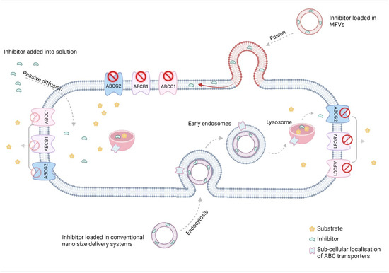 The low water solubility of efflux transporter inhibitors, combined with the stiffness of resistance cell membranes, poses challenges for the passive diffusion of these inhibitors’ inhibitory effects. While most conventional nano-sized delivery systems address the solubility issue, they often fail to tackle a primary obstacle to poor bioavailability: the inactivation of drugs taken up via endocytosis in the endo/lysosomes. The unique characteristics of MFVs present an excellent opportunity to deliver lipophilic inhibitors of ABC transporters directly to their site of action in the transmembrane domain (TMD) of the cell membrane (The figure was created using BioRender.com. Acceded on 15 April 2022).