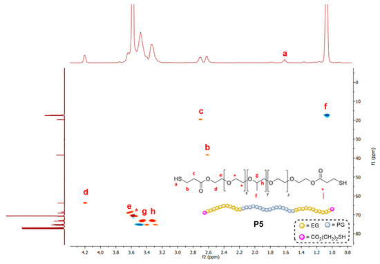 The characterization of P5 is discussed as an example. The HSQC spectrum is presented in Figure 1, while the individual 1H and 13C spectra are included in Figure S1. Compared to the precursor polymer, P5 showed three new multiplets in the 1H-NMR spectrum at 1.65, 2.62 and 2.71 ppm from the -CO(CH2)2SH fragment (signals a, b and c in Figure 1). Furthermore, the methylene group closer to the new ester bond (signal d) shifted to 4.2 ppm. The methylene groups from the ethylene glycol (EG) units (labeled as *, e) and those from the propylene glycol (PG) units (labeled as f, g, h) exhibit much less shifting. In 13C-NMR, a signal around 171.0 ppm is observed, assigned to the carbonyl group. This polymer was also studied through MALDI-TOF. A Gaussian curve is observed between 700 and 3500 Da, centered around 2200 Da (Figure S5). Despite the complexity of the spectra, due to the variable number of EG and PG units, it confirmed the correct attachment of both terminal thiol units.