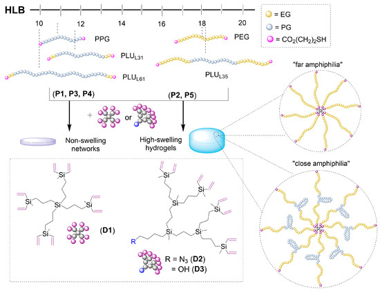Schematic overview of the synthesis of the dendritic networks. Top: Polymer precursors P1–P5, including their HLB. Bottom: Dendritic precursors D1–D3. Middle: Resultant networks and hydrogels, including representation of their nanostructuring in water. In “far” amphiphilia, the hydrophobic and hydrophilic sections are provided by different components (dendrimer and PEG, respectively), so the hydrophobic pockets are located more distantly in the hydrogel. In “close” amphiphilia, the polymer is intrinsically amphiphilic (Pluronic L35), and the hydrophobic pockets caused by the dendrimer and the PPG sections are found closer.