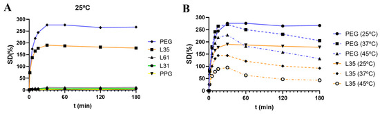 (A) Comparative swelling degree at 25 °C of hydrogels Hy[(Si-G1V8)x(PX)], prepared from carbosilane dendrimer D1 and the different polymers. (B) Comparative swelling degree at 25, 37 and 45 °C of hydrogels based on PEG1k and PLUL35.