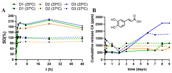 Comparative swelling degree (A) and cumulative release of caffeic acid (B) at 25 and 37 °C of Hy[(X-GnV8)x(PLUL35)] hydrogels, with Si-G1V8 (D1), N3-G3V8 (D2) and HO-G3V8 (D3).