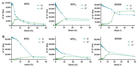 Amplitude sweeps at 25 °C (A) and 37 °C (B) for each hydrogel H5X.