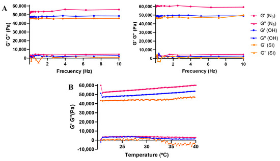 The measurements must be performed within the linear viscoelastic region (LVR), where the material can be deformed without losing its microstructural properties. We calculated the LVR through an amplitude sweep assay at 25 and 37 °C, keeping the frequency at 1 Hz and varying the oscillatory strain from 0.1% to 100%. A sudden drop in G′ that ultimately intersects with G″ indicates the critical strain, where the material microstructure is altered and, therefore, its viscoelastic properties. As depicted in Figure 5, the temperature is crucial for the critical deformation. At higher temperatures, the hydrogel can tolerate higher strains before being permanently deformed. For H5Si, the critical strain switches from 10% (25 °C) to 25% (at 37 °C). For H5N3, it changes from 12% to 27%, and for H5OH, from 17% to 45%. Accordingly, we selected 1% OS as the optimum.