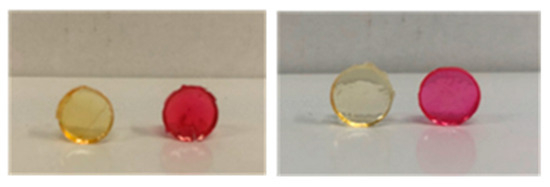Image depicting hydrogels Hy[(HO-G3V8)x(PLUL61(SH)2)] (H4OH) and Hy[(N3-G3V8)x(PLUL61(SH)2)] (H4N3) before (yellow color) and after (pink color) covalent attachment of Rhodamine B.