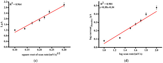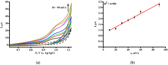 The irreversibility of the oxidation process was also confirmed by means of linear dependence of plot of (E) on logarithmic (ν) in accordance with Laviron’s theory (Figure S1) [47,48,60,61,62,63,64,65,66].