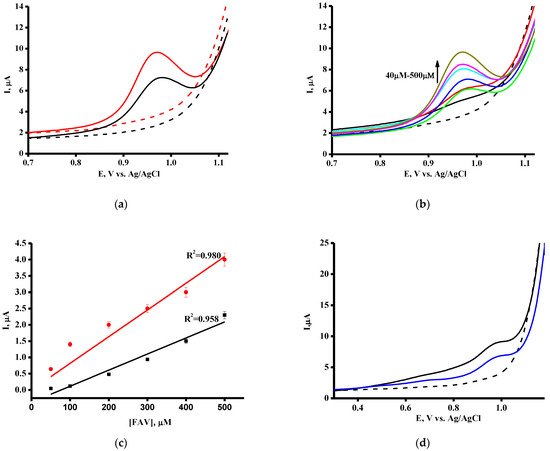 (a) Comparative DPV curves of 500 µM FAV on SPE/CNT (black) and SPE/CNT/TiO2 (red), (---) and (---) curves corresponded to blank electrodes; (b) DP voltammograms recorded in 0.1 M potassium phosphate electrolyte buffer, pH 7.4 (PBS) with increasing FAV concentration in the range of 50–500 µM (-), 40 µM; (-) 100 µM; (-), 150 µM; (-), 200 µM; (-) 300 µM; (-), 400 µM; (-), 500 µM. Dashed black line represents DPV of SPE/CNT/TiO2 in PBS. The standard deviation of the DPV response on the SPE/CNT/TiO2 for three experiments was ± 5%; (c) DPV peak current versus the concentration of FAV for SPE/CNT (black) and SPE/CNT/TiO2 (red); (d) DPV of first (-) and second (-) scan of 50 µM SPE/CNT/TiO2.