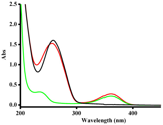 Absorption spectra in presence of 0.075 mg/mL dsDNA (black), 25 μM FAV (green), and FAV/dsDNA complex (red) in PBS.