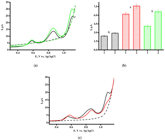 (a) DPV of dsDNA (1.5 mg/mL) on SPE/CNT (black line) and SPE/CNT/TiO2 (green line), blank SPE/CNT (---) and SPE/CNT/TiO2 (---); (b) histogram of oxidation peak current for dsDNA (1.5 mg/mL) for SPE/CNT (1) and SPE/CNT/TiO2 (2); (c) DPV of first (black line) and second scan (red line) of dsDNA (1.5 mg/mL) on SPE/CNT/TiO2.