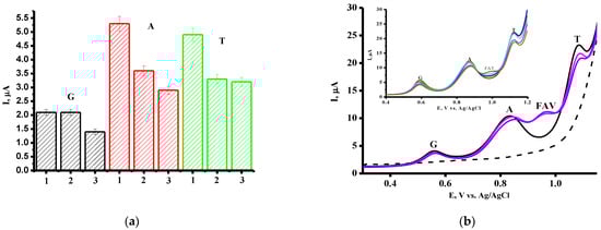 (a) The average guanine, adenine and thymine signals after interaction with 500 µM FAV at 0 min (1), 5 min (2) and 40 min (3); (b) DPV of dsDNA (1.5 mg/mL) on SPE/CNT/TiO2 (black line), blank SPE/CNT/TiO2 (---) and FAV/dsDNA complex with 400 µM FAV concentration (-), 500 µM FAV concentration (-). Inset: DP voltammograms of dsDNA in the presence of FAV in the concentration range of 50–500 µM (from (-, 50 µM) to (-, 500 µM).