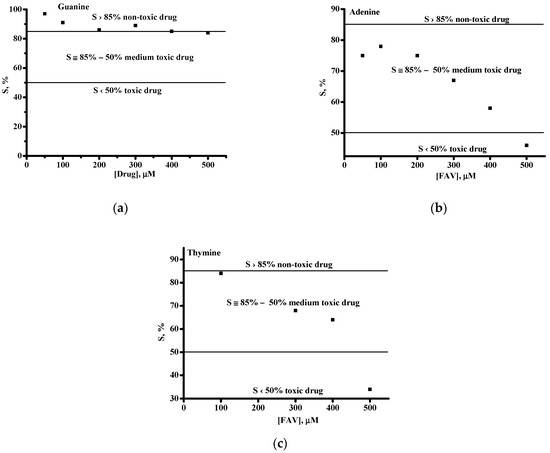 where Sb and Ss are nucleobase oxidation signals before and after interaction of the FAV with dsDNA, respectively [40,41,84]. We used this criterion such that if a drug does not have a toxic effect, S is higher than 85%; it has a moderate toxic effect if the S parameter is between 50 and 85%, and has a toxic effect if S is below 50% [83]. FAV manifested a toxic effect only at a 500 μM concentration (Figure 6a–c).