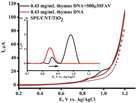The electrochemical technique was used for the investigation of the FAV/dsDNA interaction mechanism as a sensitive and robust technology. Earlier, we showed that electrochemical oxidation of dsDNA was successfully achieved on SPE/CNT after dsDNA immobilization by physical entrapment/absorption on the surface of the modified electrodes. Modification of SPEswith CNT stabilized with carboxymethylcellulose (SPE/CNT) allowed the registering of electrochemical oxidation of guanine, adenine and thymine in the immobilized dsDNA [40,41,71]. Adding nanosized titanium (IV) oxide TiO2 improved the sensitivity of electrodes for the registration of dsDNA (Figure 4a,b), as in the case of protein registration [43]. Based on this data, we used SPE/CNT/TiO2 for the investigation of interaction between FAV and dsDNA. We carried out electrochemical measurements with the DPV method. DPV was chosen as a sensitive and informative technique for drug/DNA assay. The main advantage of DPV is also a significant decline in the contribution of capacitive current in comparison with faradaic current.