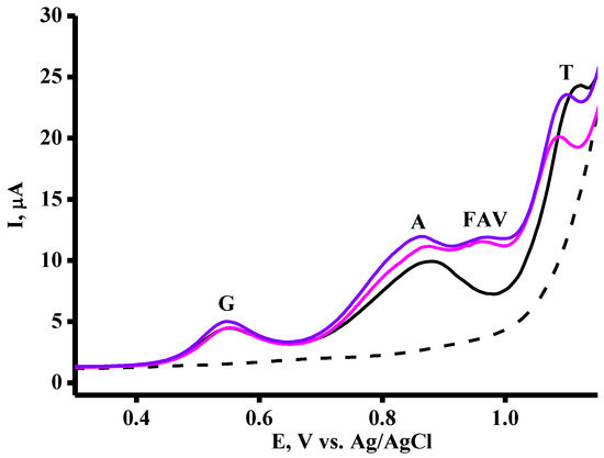 The adequacy of the proposed approach was evaluated by experiments in which the dsDNA sensor was incubated in phosphate buffer pH 7.4 without adding FAV. No changes in G, A or T oxidative peak current intensities were observed. In contrast, the interaction of dsDNA with FAV is accompanied by a decrease in the peak current intensities of G, A and T heterocyclic bases (Figure 5b). The influence of FAV is accompanied by a shift of the oxidation potentials of the heterocyclic bases of G, A and T in the anodic direction, registered as 4 ± 2 mV, 10 ± 2 mV and 5 ± 2 mV, respectively. The most pronounced shift was registered for adenine oxidation. Based on this experimental data, it is possible to assume that FAV interacts more intensively with adenine than with guanine or thymine. Positive shifts, observed for registered heterocyclic bases, corresponded to the intercalative mode of drug/DNA interaction mechanisms, as was confirmed during the study of numerous examples [48,49,50,51,52].