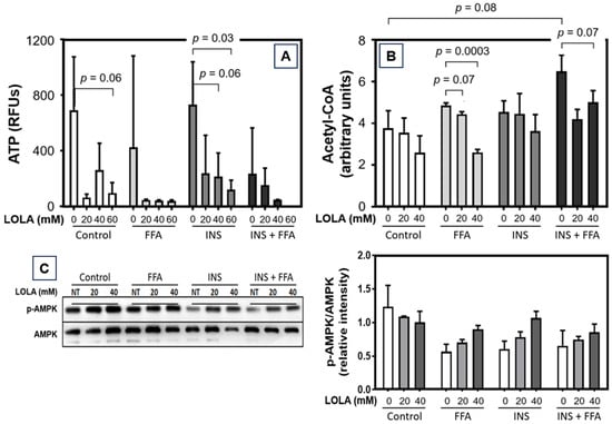 Dose-dependent effects of LOLA on the production of (A) ATP and (B) Acetyl-CoA in HepG2 cells under in vitro models of steatosis (FFA), insulin resistance (insulin), and metabolic syndrome (FFA + INS) compared to untreated controls (all conditions: n = 3; arithmetic means ± SD, and 2-way ANOVA with Tukey’s post hoc test was used for the statistical analyses of these experiments). (C) Dose-dependent effects of LOLA in untreated HepG2 cells and in in vitro models of steatosis (FFA), insulin resistance (INS), and metabolic syndrome (INS + FFA) on the expression of AMP-activated protein kinase α (AMPK-α), a key mediator of energy balance and mitochondrial biogenesis. An exemplary immunoblot is depicted on the left (all conditions: n = 3; arithmetic means ± SD).