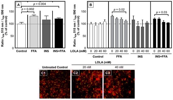 Mitochondrial membrane potential (ΔΨm) in HepG2-based in vitro conditions of steatosis (FFA), insulin resistance (INS), and metabolic syndrome (INS + FFA) are normalized by LOLA. (A) Compared to an untreated control condition set at 100%, ΔΨm was depolarized in the models of steatosis, insulin resistance, and metabolic syndrome. (B) LOLA concentration-dependently reconstituted ΔΨm. [(A,B) All conditions: n = 3; arithmetic means ± SEM; statistical significance by 2-way ANOVA with Tukey’s post hoc test.] (C) In fluoromicrographs of mitochondria stained with fluorescent dye JC-10, no leakage of the dye became apparent under LOLA treatment alone at different concentrations (C2,C3) when compared to the untreated control (C1).