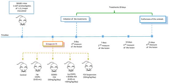 Thus, this work reports the evaluation of the therapeutical efficacy of chloroaluminum phthalocyanine-loaded liposomes (Lip-ClAlPc) combined with the oral treatment of FEX-loaded SEDDS (SEDDS-FEX) as a new therapy for the treatment of CL caused by L. (L.) major.