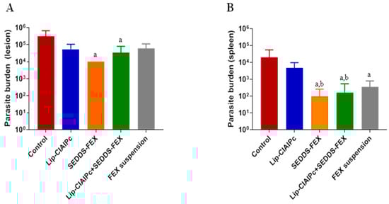 The parasite burden in the spleen is presented in Figure 3B. In fact, all formulations containing fexinidazole that were administered at doses of 50 mg/kg/day (Lip-ClAlPc+SEDDS-FEX (6 × 102), SEDDS-FEX (1 × 102), and FEX suspensions (8 × 102)) were able to significantly reduce the parasite load in the spleen (Figure 3B) when compared with the control group (2 × 104) (p < 0.05). It was also possible to observe a statistical difference in the Lip-ClAlPc group (6 × 103) when compared with the SEDDS-FEX and Lip-ClAlPc+SEDDS-FEX groups (p < 0.05) (Figure 3B). However, the Lip-ClAlPc group does not differ statistically from the FEX suspension group (p > 0.05). It is interesting to note that the SEDDS-FEX treatment led to a greater reduction in parasite loads in the lesion and the spleen than the FEX suspension treatment. This finding is probably related to increased bioavailability, which may be related to the complete solubilization of FEX when administered in the form of SEDDS-FEX.