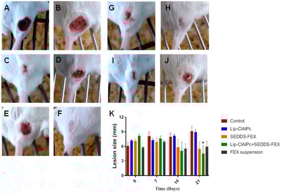 At the beginning of the treatment, the animals presented lesions with an average diameter equal to the following: control group (6.1 ± 1.9 mm), Lip-ClAlPc (7.2 ± 0.6 mm), SEDDS-FEX (7.1 ± 1.0 mm), Lip-ClAlPc+SEDDS-FEX (8.1 ± 0.9 mm), and FEX suspension (5.8 ± 0.7 mm); there were no significant differences between all groups (p > 0.05) (Figure 4K). It is possible to verify that the Lip-ClAlPc+SEDDS-FEX group was the only one that significantly reduced the size of the lesion in relation to the control group on the 21st day (p < 0.05) (Figure 4K). The images of the animals lesions at the beginning of treatment (day 0) and at the end (21 days) are presented in Figure 4: control group (Figure 4A,B), Lip-ClAlPc (Figure 4C,D), SEDDS-FEX (Figure 4E,F), Lip-ClAlPc+SEDDS-FEX (Figure 4G,H), and FEX suspension (Figure 4I,J).