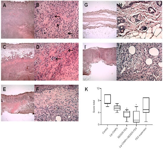 Histopathological analysis (H&E) was performed in the control group (A,B), Lip-ClAlPc (C,D), SEDDS-FEX (E,F), Lip-ClAlPc+SEDDS-FEX (G,H), and FEX suspension (I,J). The first image on the right presents 4× magnification, and the second image on the left the image presents 40× magnification. Arrows indicate the regions with inflammatory processes. (K) Total score of the histopathological analysis. Data presented as median, maximum, and minimum. The groups treated with SEDDS-FEX and Lip-ClAlPc+SEDDS-FEX exhibited statistical differences when compared to the control group (* p < 0.05) (n = 7).
