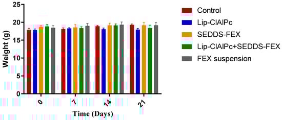 Evaluation of the weight of BALB/c mice infected with L. (L.) major and submitted to different treatments. Female BALB/c mice were infected with L (L.) major promastigotes at the base of the tail. After the development of ulcerated lesions, the animals were treated with the Lip-ClAlPc, SEDDS-FEX, Lip-ClAlPc+SEDDS-FEX, FEX suspension, and Control (untreated). Animals were weighed at baseline (0 days) and on days 7, 14, and 21 after starting treatment. The bars represent means and standard deviations. Comparisons between the weights at all times were not statistically significant (p > 0.05).