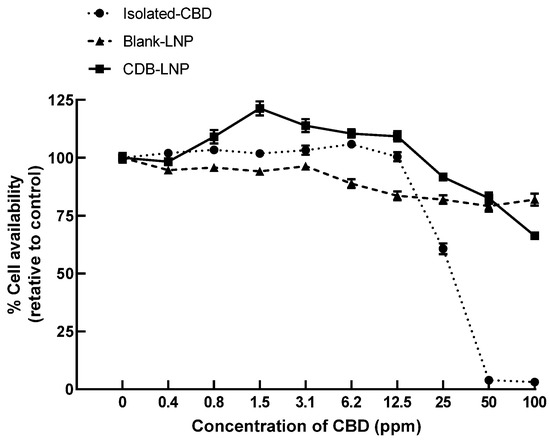 Further, the cytotoxicity of CBD-LNP, CBD, and vehicle-LNP was evaluated using SH-SY5Y culture cells by incubating them for 24 h. As shown in Figure 1, the results clearly indicated that the toxicity of CBD-LNP was considerably lower than the isolated CBD natural form. It suggests that LNP formulation alleviates the toxicity of CBD from direct contact to neuron cell lines. Moreover, the results obviously demonstrated that CBD-LNP has enhanced neuron cell proliferation at low concentrations due to high cellular uptake, and less toxicity compared with blank-LNP and CBD. These are the advantages of CBD-LNP as a potential treatment to provide benefits in animal studies.