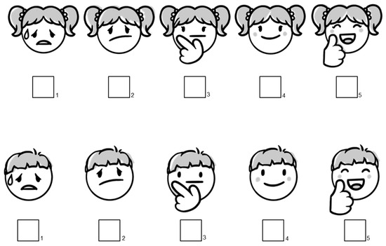 - Hall, L.; Hume, C.; Tazzyman, S. Five Degrees of Happiness: Effective Smiley Face Likert Scales for Evaluating with Children. In Proceedings of the 15th International Conference on Interaction Design and Children (IDC ‘16), Manchester, UK, 21–24 June 2016; Association for Computing Machinery: New York, NY, USA, 2016; pp. 311–321. [Google Scholar]