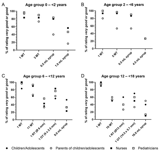 In the oldest age group (Figure 2D), the assessment of mini-tablets was similar for all participant groups, with 90% to 100% of participants rating 1 mini-tablet and 50% to 60% rating 70 mini-tablets as very good or good (Table 3). For the other formulations, the differences in ratings were more pronounced. One round tablet was judged as very good or good by 60% of adolescents, 40% of pediatricians, and 27% of parents and nurses. Between 33% (parents) and 70% (adolescents) of participants considered one oblong tablet as very good or good. For syrup, 40% of adolescents and 50% of parents rated it as very good or good, but only about 10% of both healthcare professional groups.