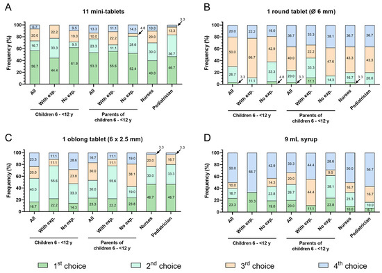 The selection of mini-tablets as first or second choice by parents of children with or without experience of regular oral medicine administration was comparable (67% and 81%). More parents of experienced children selected the round and oblong tablet (44% and 78%) as compared to those of children with no experience (14% and 43%). Regarding syrup, only 11% of parents with children experienced in regular oral medicine intake ranked this formulation as their first or second choice but 43% of parents with inexperienced children did so (Figure 3B,C and Figure 4A–D).