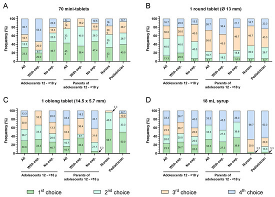Ranking of formulations in the age group 12–<18 y by participant groups. The graphs show the percentage of each participant group who ranked the respective formulation (A) 70 mini-tablets, (B) 1 round tablet (Ø 13 mm), (C) 1 oblong tablet (14.5 × 5.7 mm), (D) 18 mL syrup as 1st, 2nd, 3rd, or 4th choice. For adolescents and parents of adolescents, the percentage is given for all participants of these 2 groups and separately by experience with regular oral medicine intake. exp. = experience.