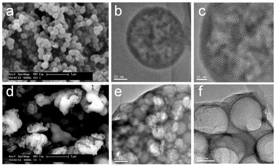 SEM (a,d) and TEM (b,c,e,f) images of HMS nanoparticles (a–c) and HPS microparticles (d–f).