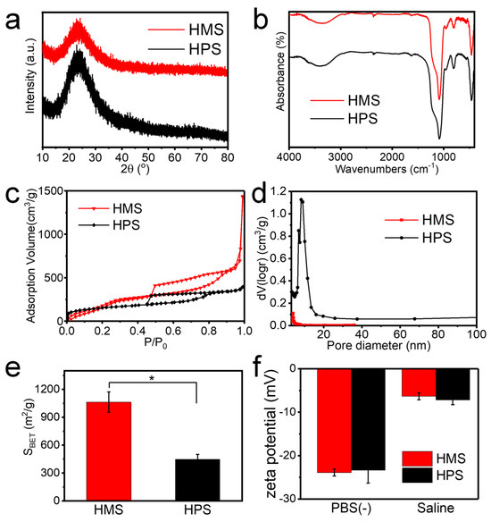 XRD patterns (a), FTIR spectra (b), N2 adsorption–desorption isotherms (c), pore size distribution curves (d), BET surface area (e), and zeta potential (f) of HMS nanoparticles and HPS microparticles (n = 3, * p < 0.05).