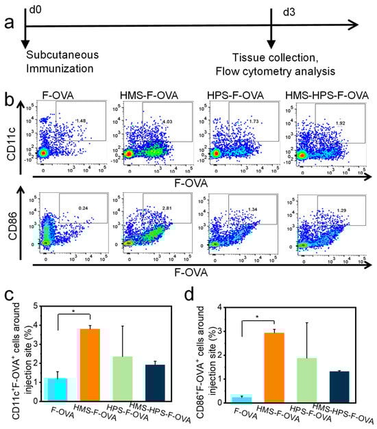 HMS nanoparticles promoted cellular uptake of F-OVA around injection site in vivo. Experimental protocol (a); CD11c+F-OVA+ cells around injection site (b,c); CD86+F-OVA+ cells around injection site (b,d) 3 days after immunization (n = 3, * p < 0.05).
