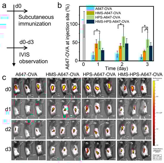 HPS microparticles prolonged A647-OVA retention time around injection site in vivo. Experimental protocol (a); percentage of A647-OVA remaining at the injection site observed by an in vivo imaging system (b,c) (n = 3, * p < 0.05). The data in d0 of b were calculated from A647-OVA, HMS-A647-OVA, HPS-A647-OVA, and HMS-HPS-A647-OVA.