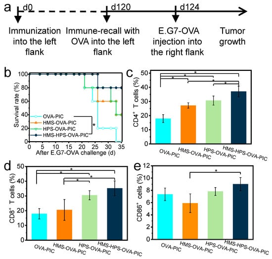 HMS nanoparticles and HPS microparticles showed synergistic anti–tumor immunity in vivo. Experimental protocol (a), survival rate of mice (b) (n = 5, * p < 0.05). HMS-HPS-OVA-PIC immunized mice showed highest CD4+, CD8+, and CD86+ (quantitative results, (c–e)) cells in draining lymph nodes of mice (n = 5, * p < 0.05).