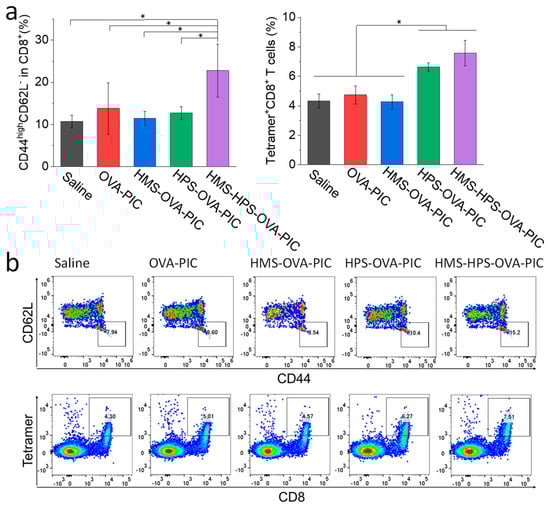 Quantitative (a) and representative (b) results of effector memory CD44highCD62L– in CD8+ T cells and tumor–specific tetramer+CD8+ T cells in splenocytes of mice (n = 3, * p < 0.05).