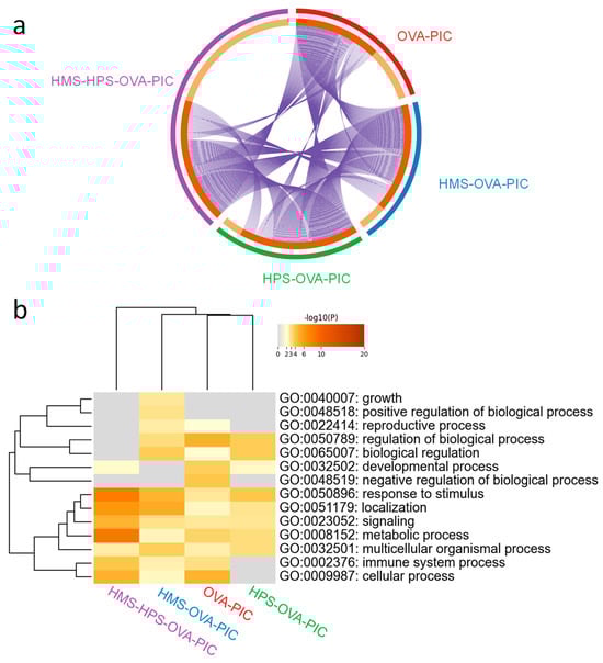 Gene overlap analysis (a); Heatmap of the top–level gene ontology biological processes, colored by p-values (b).