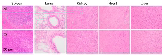Representative histological pictures of major organs stained with H&E at d104 after one–shot vaccination. Saline (a); HMS-HPS-OVA-PIC (b).