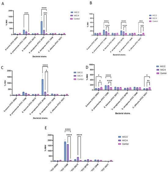 | MIC/4 (mg/mL) | 0.3125 | 2.5 | 2.5 | 0.078 | 0.625 | 0.625 | 0.3125 | 2.5 | 2.5 | |