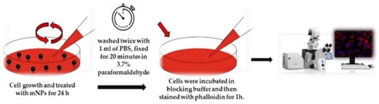 For confocal imaging analysis, we followed the protocol published before [17]. Briefly, 1 × 105 cells were grown on glass coverslips with polylysine, incubated with mNPs for 24 h, and then washed twice with 1 mL of PBS, fixed for 20 min in 3.7% paraformaldehyde in PBS, and permeabilized with 0.1% Triton X-100 in PBS for 5 min. Cells were treated in a blocking buffer (3% BSA and 0.1% Triton X-100 in PBS) for 1h at rtand stained with phalloidin for 1 h. Hoechst33342 dye (Blue) (10 µg/mL) (Invitrogen, Waltham, MA, USA) was used for nuclei staining for 15 min incubation at rt. An anti-fade mounting medium (Biomeda, Foster City, CA, USA) was used for observing the labeled cells under a Bio-Rad MRC 1024 ES Confocal Laser Scanning Microscope (Bio-Rad, Hercules, CA, USA) equipped with a 15 mW Krypton/Argon laser source for fluorescence measurements (Figure 1). Cells were examined with a Nikon Plan Apo X60oil immersion objective using an excitation wavelength appropriate for Alexa 488 (495 nm). A series of optical sections (XY: 512 × 512 pixels) were then taken through the depth of the cells with a thickness of 1 µm at intervals of 0.8 µm (Z step). A single composite image was obtained by the superimposition of twenty optical sections for each sample [17].