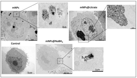 As reported in Figure 2, the presence of mNP clusters within the cell cytoplasm after a 24 h treatment suggests that cellular uptake of the nanoparticles has occurred. It appears that all three types of nanoparticles, including citrate-coated, bare, and NaHB4-coated nanoparticles, were able to enter the cells and form clusters. The finding that a massive amount of mNPs@citrate and mNPs were accumulated compared to mNPs@NaBH4 could indicate differences in their cellular uptake mechanisms or efficiency. For instance, mNPs@citrate are known to have a negative surface charge, which is unfavorable for interactions between the nanoparticles and negatively charged cell membranes. Despite this repulsion, Forest and Pourchez et al. [26] reported the internalization of negatively charged nanoparticles due to cationic sites of cellular membrane allowing the development of electrostatic interactions leading to subsequent internalization. Without any surface coating, mNPs could potentially have more direct contact with the cell membrane, promoting their uptake. As for mNPs@NaBH4, the surface chemistry and their size possibly affect their internalization ability.