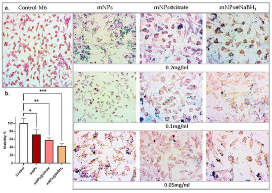 Since in our previous paper [13] the mNPs tested at all different concentrations did not cause obvious toxicity of NCTC 2544, we evaluated cell viability of cancer cells (A375-M6) with the three types of mNPs at the highest concentration (0.2 mg/mL) for 24 h. As shown in Figure 3b, the treatment induced a significant reduction in the cell viability of A375-M6 and morphology changes such as cell shrinkage (Figure 3a), which is a characteristic feature of cell death. The optical images stained with Prussian blue, which detects the iron ions, provide visual evidence of these changes (Figure 3b). According to our results, we can indicate that the mNPs@citrate experienced a higher reduction in cell viability and higher levels of cell shrinkage, confirmed by the Prussian blue protocol. Based on that, Prussian-stained nanoparticles in the optical images provide strong evidence in support of the internalization vs. toxicity profile in the A375-M6 cells. The figures for treated cells represent fully stained nanoparticles in the internal area and on the cell surface. These results are in good agreement with the results in Section 3.2.