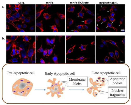 To investigate whether the mNP-induced growth inhibition and the cytotoxic effects on melanoma cells were due to programmed cell death, confocal microscopy was performed by staining F-Actin with phalloidin to evaluate cytoskeletal damage. It is well known that cell structure integrity can be evaluated by actin filaments with phalloidin. Membrane blebbing, or rather bubble-like protrusions on the cell surface, is a morphological alteration of cell damage, featuring early apoptosis. Confocal microscopy on A375-M6 revealed (Figure 4a) a blebbing onset of the plasma membrane induced by bare mNPs and intensive blebbing activity in the presence of mNPs@citrate and mNPs@NaBH4. No notable variations in the cytoskeletal structure were detected when NCTC 2544 cells were exposed to the three distinct mNPs, meaning that mNPs leave this type of healthy cells unaffected (Figure 4b).