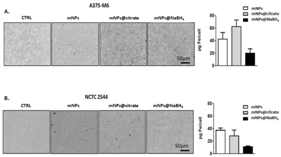 Optical microscopy and ICP analysis of (A) A375-M6 cells and (B) of NCTC 2544, treated with mNPs, mNPs@citrate, and mNPs@NaBH4.