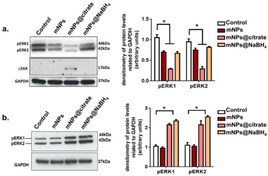 Cell survival and death can be evaluated by studying many protein kinases. A375-M6 cells harbor the V600E BRAF mutation which is associated with the mitogen-activated protein kinase (MAPK) signaling pathway resulting in ERK1/2 phosphorylation [17]. This process activates the nucleus and phosphorylates a plethora of substrates that stimulate cell proliferation. The activation of ERK1 inhibits mitochondrial permeability, leading to the inhibition of mitochondrial apoptotic pathways [27]. To further investigate the mechanism involved in the induction of apoptosis in A375-M6 cells, ERK and H2AX phosphorylation levels were studied upon treatment with all mNPs. H2AX phosphorylation resulted inγH2AX, which is a specific marker for DNA double-stranded breaks involved in damaged DNA repair and responsible for the degradation of DNA leading to cell death [28,29]. Western blot images and analyses showed a significant decline in ERK1 phosphorylation induced by all the mNPs (Figure 6a). Nevertheless, a greater reduction inERK1/2 phosphorylation was observed upon mNPs@citrate treatment, along with noticeable levels of H2AX phosphorylation. No detectable γH2AX protein levels were perceived after mNPs and mNPs@NaBH4, as well as after all mNPs treatment on NCTC 2544. It should also be noted that ERK1/2 phosphorylation in NCTC 2544 cells was unaffected by mNP treatment, whereas mNPs@citrate and mNPs@NaBH4 induced a strong increase in phosphorylation (Figure 6b and Figure S1). Notably, western blot analysis, along with the cell viability and confocal data, confirms the major toxic effects of mNPs on melanoma cells A375-M6, while healthy cells were found to remainremarkably unscathed even though they incorporated a fair amount of mNPs.