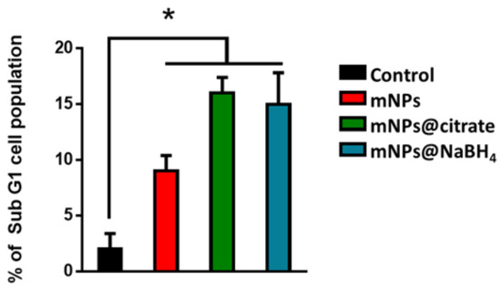Cell cycle analysis was performed through the propidium iodide (PI) staining method [18]. According to this methodology, the sub-G1 cell population was analyzed. A total of 1.5 × 105 cells were treated with mNPs, as previously mentioned, and the pellet was harvested for 24 h after centrifugation. The cells were washed with PBS two times and stained with PI for 30 min in the dark at rt (100 μg/mL PI, 20 μg/mL RNase A, 1 mg/mL trisodium citrate, and 0.3% (v/v) Triton X-100). The stained cells were analyzed by flow cytometry (BD-FACS Canto) using red propidium–DNA fluorescence.