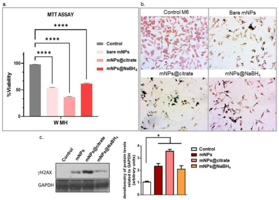 The efficacy of the magneto-mechanical potential of mNPs wares was also confirmed by western blot analysis of H2AX phosphorylation levels (Figure 8c). Results in Figure 8b show that exposure to the magnetic field significantly upregulates phosphorylated H2AX levels after mNPs@citrate treatment, while inducing the H2AX phosphorylation in the presence of mNPs and mNPs@NaBH4.