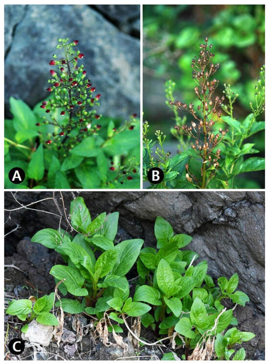 Habitat and morphology of Korean endemic Scrophularia takesimensis in natural population of Ulleungdo. (A) Inflorescence. (B) Infructescence. (C) Habitat and previous flowering stage.
